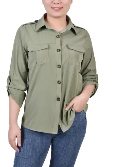 NY COLLECTION Petites Womens Collared Pocket Button-down Top In Green