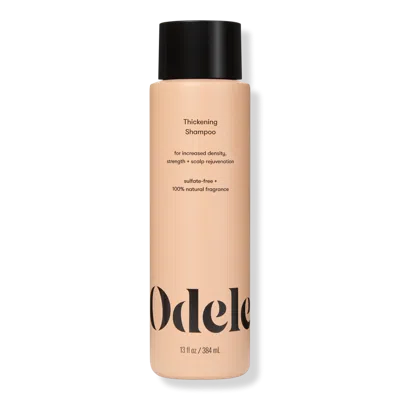 ODELE THICKENING SHAMPOO 13.0OZ. Benefits: 3X fuller-looking hair*. Supports increased density, strength + scalp rejuvenation. Best for all hair types and textures. *According to 3rd party lab testing conducted using both the Thickening Shampoo & Conditioner as a regimen. Individual results may vary.. Features: Dermatologist Tested. Color Safe. Natural fragrance of cucumber, ylang ylang + oak moss. Gender Neutral. Woman Owned + Operated. Key Ingredients: Rosemary: Helps revitalize + stimulate the scalp. Caffeine: Helps improve circulation + stimulates the scalp. Biotin: Helps boost density + strengthens hair. Pea Peptides: Helps create fuller-looking hair. Aloe Vera: Promotes healthy hair + scalp. Ginger + Peppermint: Creates a cooling sensation and soothes. Formulated Without: SLS or SLES Sulfates, Formaldehyde or Formaldehyde Donors, Phthalates, Parabens, Dyes, Synthetic Fragrance.