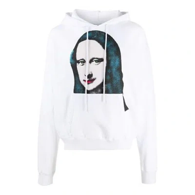 White Mona Lisa printed hooded sweater, hood, long sleeves, front decorated with Mona Lisa print, rib trim.