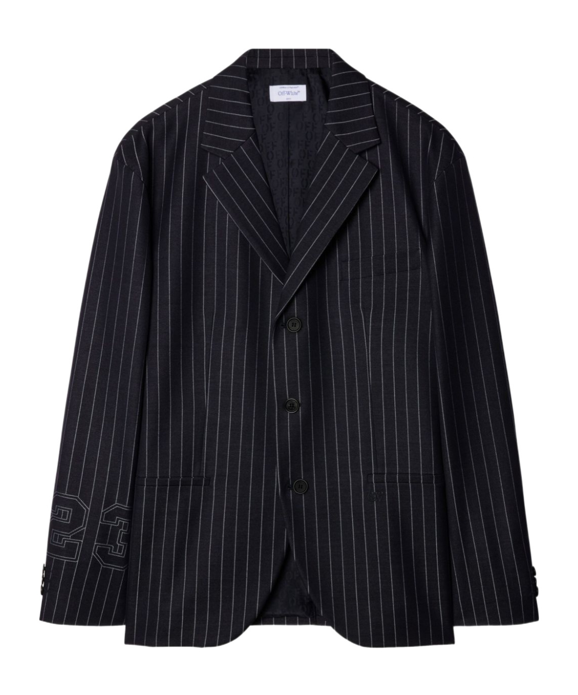 Single-breasted Off-White blazer made from a soft wool blend, showcasing a sophisticated pinstripe pattern. Tailored fit, notched lapel, and embroidered detailing on the sleeves modernize classic menswear with distinguished style. Made in Italy True to size fit Composition - 80% virgin wool, 20% polyester Color - Black
