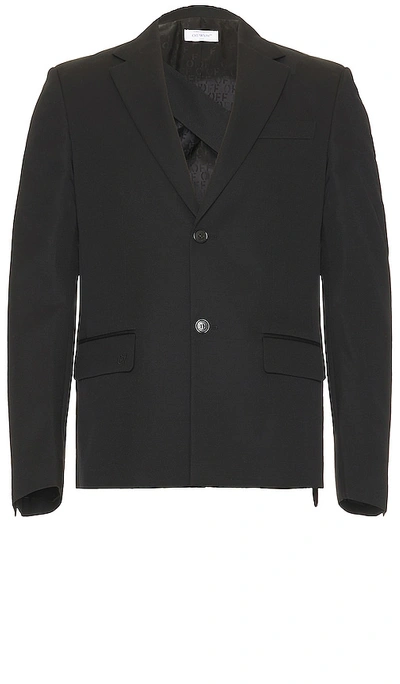 OFF-WHITE Strap Relax Jacket in Black. Size 46, 50. Self: 100% wool Lining 1: 100% viscose Lining 2: 52% viscose 48% cupro Lining 3: 100% cotton. Made in Italy. Dry clean only. Front button closure. Padded shoulders. Button cuffs. 3-pocket design. Midweight suiting fabric. OFFF-MO154. OMEN063F23FAB0011010.
