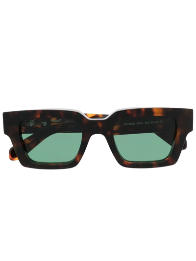 Virgil square-frame sunglasses from OFF-WHITE featuring brown, square frame, tortoiseshell effect, green tinted lenses, UV-protective lenses, signature Arrows motif, straight arms and curved tips. These glasses come with a protective case..