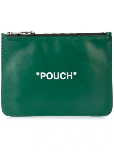 Buffed leather pouch in green. Logo and text printed in white at face. Text printed in white at back face. Zip closure featuring logo-engraved hoop hardware. Logo patch at interior. Textile lining in black. Silver-tone hardware. Tonal stitching. Approx. 8.5 length x 6.5 width.