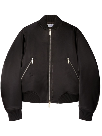 zip-detail bomber jacket from OFF-WHITE featuring black, satin finish, ribbed band collar, all-around zip fastening, long sleeves, front zip fastening, two zip-fastening pockets, ribbed cuffs and hem and straight hem.