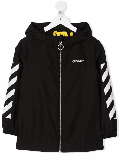 logo print rain jacket from Off-White Kids featuring black/white, waterproof, logo print to the rear, embroidered logo at the chest, graphic-print sleeves, front zip fastening, long sleeves, classic hood and straight hem.