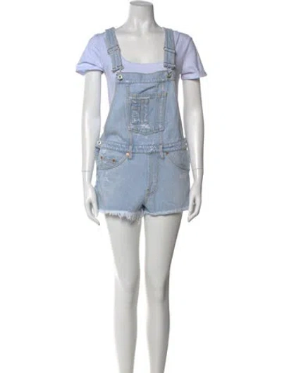 Off-White Romper Blue Distressed Accents Short Sleeve with Square Neckline Button Closure at Side Size not listed, estimated from measurements. Fit: Jumpsuits and Rompers by Off-White c/o Virgil Abloh typically fit true to size. | Off-White Square Neckline Romper in Blue, Women's S