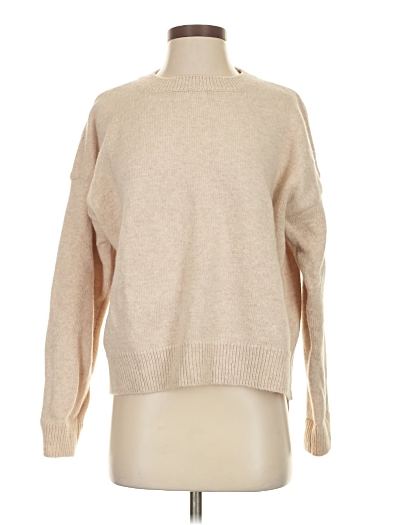 Olive Wool Pullover Sweater, Size: Small. Item Details: Tan, Solid Pattern, Mock Neckline, Long Sleeve, Women's Sweaters & Sweatshirts, Wool/Polyamide