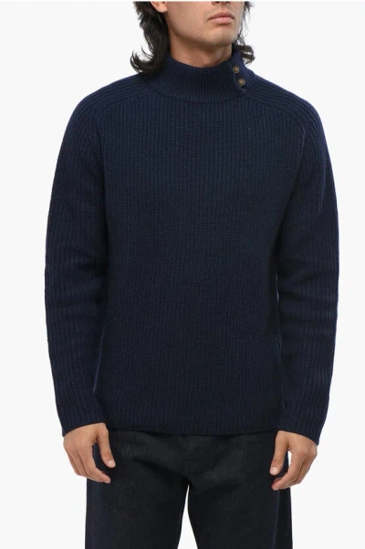 Wool And Cashmere Turtleneck Sweater With Buttons In Blue