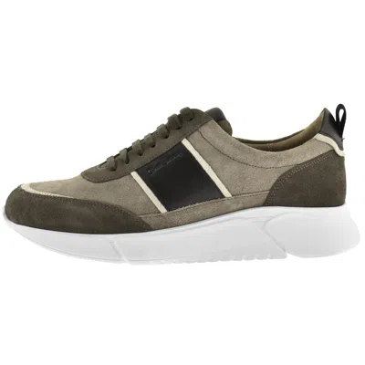 Oliver Sweeney Byram Trainers In Light Brown. Soft calf suede uppers with contrasting black leather trims which feature the signature Oliver Sweeney logo debossed. A lace fastening with a lightly padded tongue and ankle cuff featuring a woven pull loop on the heel. A chunky midsole in white and a B-LIGHT rubber outsole.