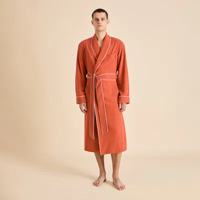 Sandwashed silk in warm rust orange forms the Mescal, our new menswear robe with a butter-soft feel and matte finish. Its relaxed cut combines comfort with understated elegance. Perfectly suited to be worn with the Laurent Rust pyjama for a fully coordinated look.Material: 100% silkMaterial Weight: 22 mommeMaterial Weave: spun silkFinish: sandwashedColour: rustTrims: ivory pipingProduct Code: PS26099