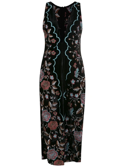 Black embroidered midi dress from OLYMPIAH featuring V-neck, sleeveless, embroidered design and mid-length.