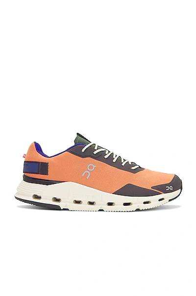 On Cloudnova Form in Terracotta & Forest - Peach. Size 9 (also in 10, 10.5, 11, 11.5, 12, 12.5, 13, 8, 8.5, 9.5). Polyester upper with manmade sole. Made in Vietnam. Lace-up front. Perforated microfiber tongue. Contrast lining. Form fitting shape. Trademark Speedboard. 40% recycled upper. ONF-MZ125. 26.98799. About the designer: