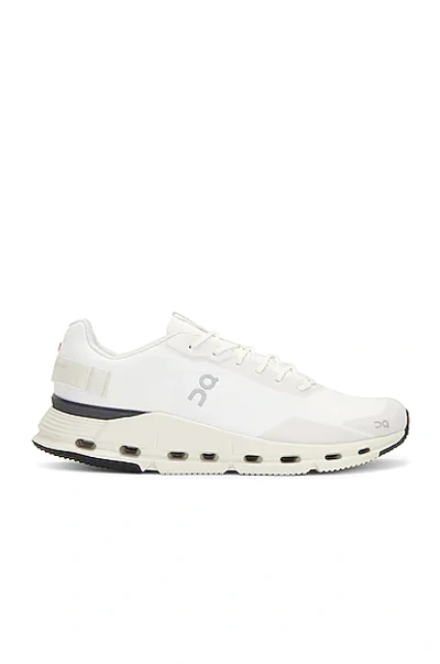 On Cloudnova Form in White & Eclipse - White. Size 7 (also in 10, 10.5, 11, 11.5, 12, 12.5, 7.5, 8.5, 9, 9.5). Polyester upper with manmade sole. Made in Vietnam. Lace-up front. Perforated microfiber tongue. Form fitting shape. Trademark Speedboard. 40% recycled upper. ONF-MZ112. 26.98483. About the designer: