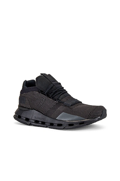 On Cloudnova in Black & Eclipse - Black. Size 9 (also in 10, 10.5, 11, 11.5, 12, 7, 7.5, 8, 8.5, 9.5). Engineered mesh upper with EVA rubber sole. Made in Vietnam. Open lace configuration Padded sock construction for soft step-in and comfort hold. Lightweight and breathable comfort fit. Zero-Gravity foam offers improved performance. Speedboard™ maximizes energy efficiency for more forward motion. CloudTec® cushioned sole. Non-waterproof. ONF-MZ6. 26.99822. About the designer: