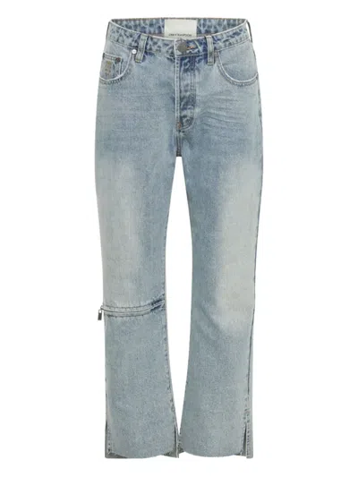 light blue zip detail at the knee raw hem five pockets button and zip fastening logo patch at the rear