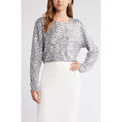 A back keyhole cutout shows a glimpse of skin this long-sleeve crop top that's scaled with shimmering sequins. 17" length (size Medium) Back keyhole with button-and-loop closure Jewel neck Long sleeves Lined 95% polyester, 5% spandex Hand wash, dry flat Imported