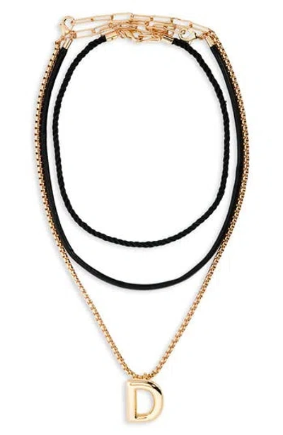 Move the bubbly initial pendant between three necklaces you can stack or wear solo. Set of three necklaces 14"–18" lengths; 3" extenders Textile/goldtone plate Imported