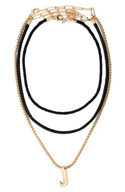 Move the bubbly initial pendant between three necklaces you can stack or wear solo. Set of three necklaces 14"–18" lengths; 3" extenders Textile/goldtone plate Imported
