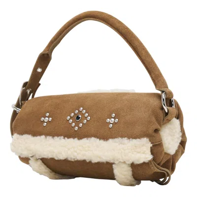 OPEN YY Shearling Stud Pillow Handle Brown Shearling trim Stud embellishment Top handle Ring detail Adjustable strap (Shell) 30% Wool, 70% Polyester (Lining) 35% Cotton, 65% Polyester Size: Width approx 27cm / Depth approx 11cm / Height approx 11cm / Handle or strap approx 33cm - 63cm