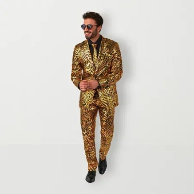 Shine bright at your next party, family event or dress-up occasion wearing this three-piece men's suit set from Opposuits. Made from a golden metallic star print fabric, it includes a single-breasted blazer with notch lapels, slim-leg pants with side slip pockets, plus a matching clip-on tie. Style it with a crisp button-down and sneakers.# Pieces In Set: 3Included: 1 Tie(s)1st Piece Description: Blazer1st Piece Collar: Notch Lapel1st Piece Front Style: Single Breasted1st Piece Pockets: 1 Chest Slip Pocket(s), 2 Front Flap Pocket(s)1st Piece Fabric: Woven1st Piece Fiber Content: 100% Polyester1st Piece Lining Material: Polyester1st Piece Care: Machine Wash2nd Piece Description: Pants2nd Piece Closure Type: Button2nd Piece Front Style: Flat Front2nd Piece Leg Style: Slim Leg2nd Piece Pockets: 2 Side Slip Pocket(s)2nd Piece Rise: At Waist2nd Piece Fabric: Woven2nd Piece Fiber Content: 100% Polyester2nd Piece Care: Machine WashFeatures: Interior Pockets1st Piece Sleeve Length: Long SleevesCare: Machine WashCountry of Origin: Imported