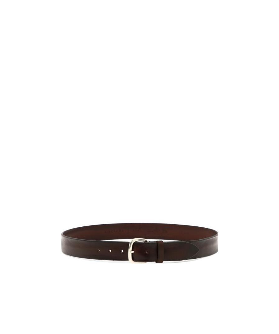 Brown logo belt, metal buckle, adjustable details, logo.