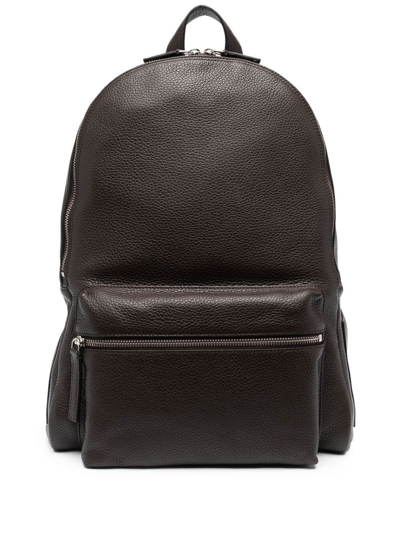 logo-plaque leather backpack from ORCIANI featuring brown, calf leather, grained texture, silver-tone logo plaque, top zip fastening, two adjustable shoulder straps, single top handle, front zip-fastening pouch pocket and side slit pocket.