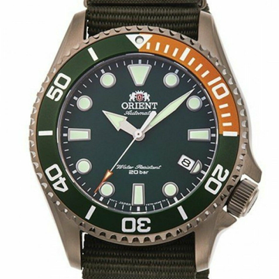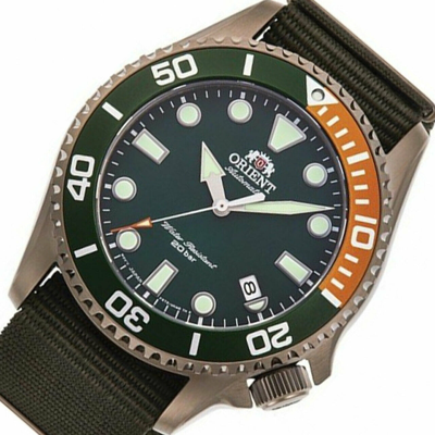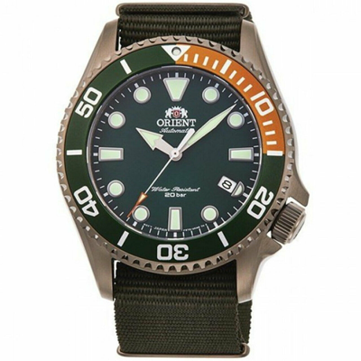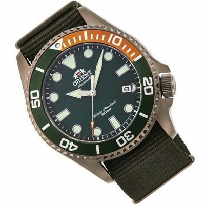 Orient RA-AC0K04E10B Analog Mens Watch Description: Green Dial Green Orange Bezel Nylon Strap 200m Water Resistance / 20 bar Date Display Analog 3 Hands Display Sapphire Crystal Glass One-Way Rotating Bezel Stainless Steel Case Automatic Movement Caliber F6722 22 Jewels Features Manual Wind Movement Second Hand Halt Mechanism Screw Case Back Screw Down Crown Case Size 3H-9H: 43.4mm Case Size 12H-6H: 51mm Case Thickness 12.8mm