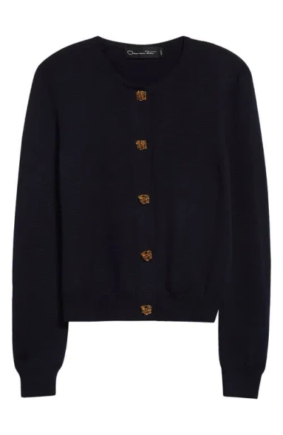 OSCAR DE LA RENTA Rose Button Wool Cardigan In Navy