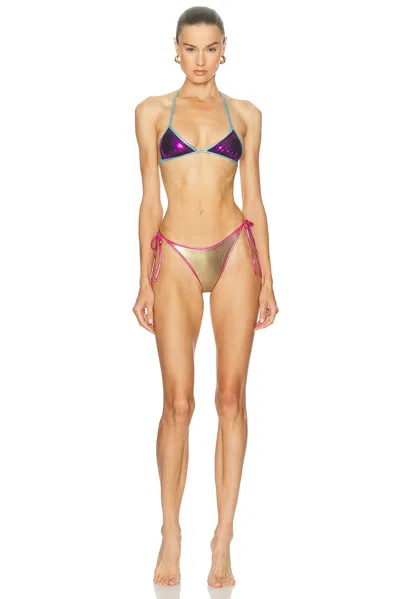 Oseree Metallic Triangle Bikini Set in Multicolor - Beige. Size M (also in L, S). 96% polyester 4% elastane. Hand wash. Unpadded cups. Self-tie halterneck and waist tie. Item sold as set. OSEF-WX93. DTF257. About the designer: Founded in 2015, Oséree is the brainchild of Italian designers Jannine Vinci and Isabella Cavallin. Named after the verb “to dare” in French, the brand creates body-accentuating styles featuring luxe fabrics and rich embellishments. Courage, intrepidity and boldness are actually the values at the core of the brand, which aims to exalt women’s unique beauty and outstanding personality, with each piece expertly handmade in Italy.