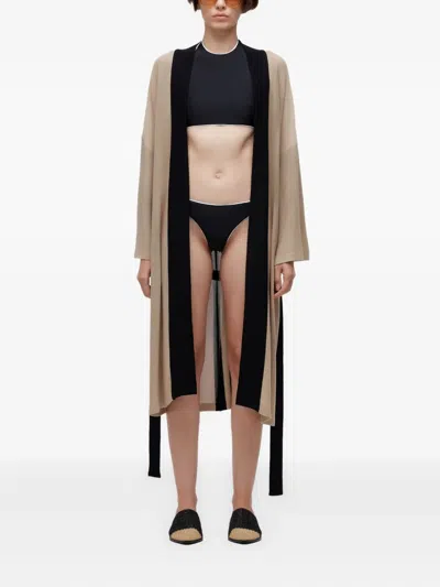 beige and black paneled design wide sleeves self-tie belt open front