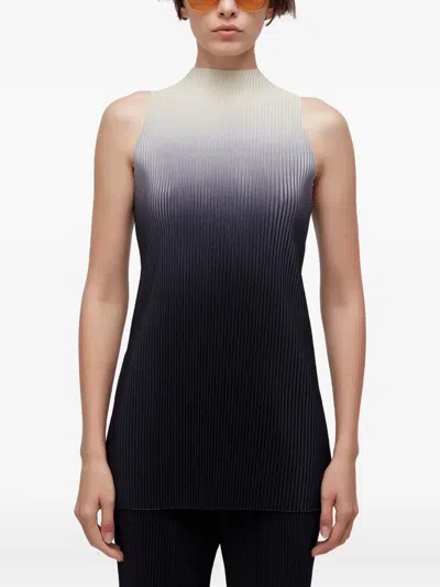 オフホワイト/ブルー プリーツ加工 ノースリーブ モックネック ストレートな裾