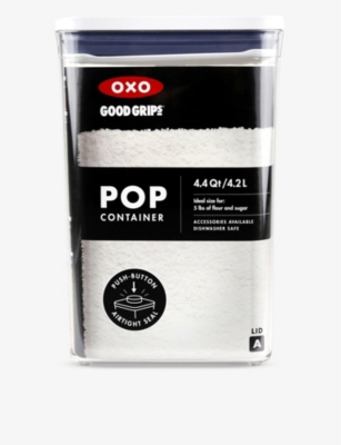 Here to keep food dry and fresh, the POP container from OXO Good Grips has arrived. Available in a variety of shapes and sizes, the airtight storage pot is ready to keep things organised and at their freshest. What’s more, the fill-line guide and curved corners make way for smooth dispensing and optimum storing. Oh, and did we mention that they’re stackable, too? Simply push the button to engage the airtight seal.| OXO Good Grips POP square medium containerAirtight, space-efficient design keeps dry foods fresh and your pantry organizedNew shapes, sizes and BPA free, dishwasher-safe construction stack perfectly with all POP Containers and can be customized to fit any spaceConvenient fill line makes it easy to store staples like cereal, flour, sugar, pasta, rice, coffee, nuts and snacksBrand-new line of solution-based accessories easily attach to the underside of POP Container lids. This container has an A lid Type so is compatible with the labels, date dial, leveler, coffee scoop, dusting scoop, and half cup scoop. Accessories sold separatelyPush the button to engage the airtight seal. The button doubles as a handle for the lid. For best results, always use the button to open and close. Do not carry POP Containers by the lidBPA free. Top-rack dishwasher safe.Height 64cm, width 41cm, depth 41cm4.2 litres