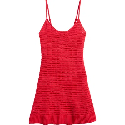 Airy open stitching gives a crocheted look to this eye-catching minidress knit from a soft cotton blend. 30" length Slips on over head Scoop neck Adjustable straps Sheer 60% cotton, 40% acrylic Machine wash, dry flat Imported