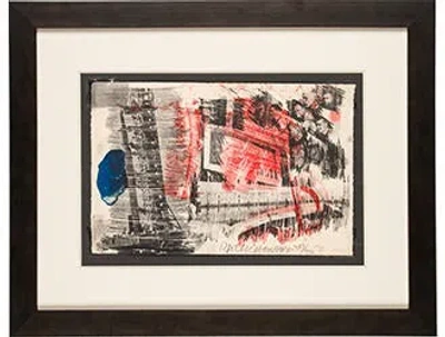 American artist Robert Rauschenberg's Sub Total is a vivid, layered lithograph from the historic Stoned Moon series, created in collaboration with NASA at the height of the Apollo space program. In this work, Rauschenberg fuses documentary imagery with gestural mark-making to form a dynamic visual field that oscillates between precision and improvisation. Fragmented photographs of spacecraft architecture and mission diagrams are interrupted by broad swaths of color and hand-drawn textures that destabilize the otherwise mechanical imagery. Rauschenberg's Stoned Moon prints are housed in the permanent collections of the San Francisco Museum of Modern Art (SFMoMA), the Smithsonian American Art Museum (SAAM) and the Robert Rauschenberg Foundation among others. | Sub Total (Stoned Moon), Small