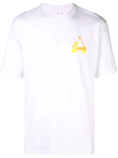 The Palace Tri-Shadow T-shirt offers a fresh take on the skateboard brand's logo tee. Switching up Palace's Tri-Ferg logo, the white short sleeve tee utilizes shades of white, yellow, and orange to create the "Tri-Shadow." A smaller version is featured on the left chest and a larger one on the back. The Tri-Ferg logo is a modified version of the Penrose Triangle, an optical illusion consisting of an object which can be depicted in a drawing.