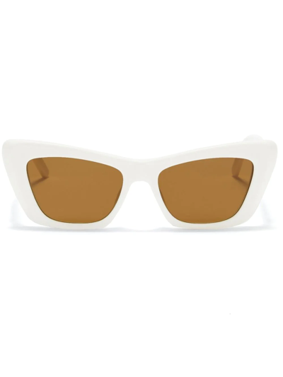 Hermosa rectangular-frame sunglasses from PALM ANGELS featuring white, rectangle frame, brown tinted lenses, gold-tone logo plaque, logo plaque at the arm, straight arms and curved tips. These glasses come with a protective case..