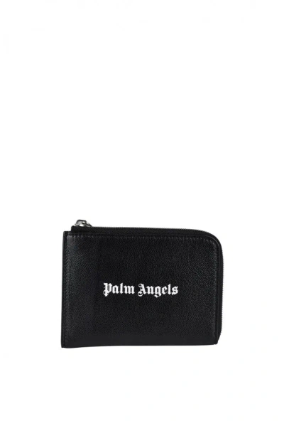 Palm Angels wallet in black grained leather. White logo printed on front. Detachable interior card holder. One central slot with zipper closure. 100% leather. Made in Italy.