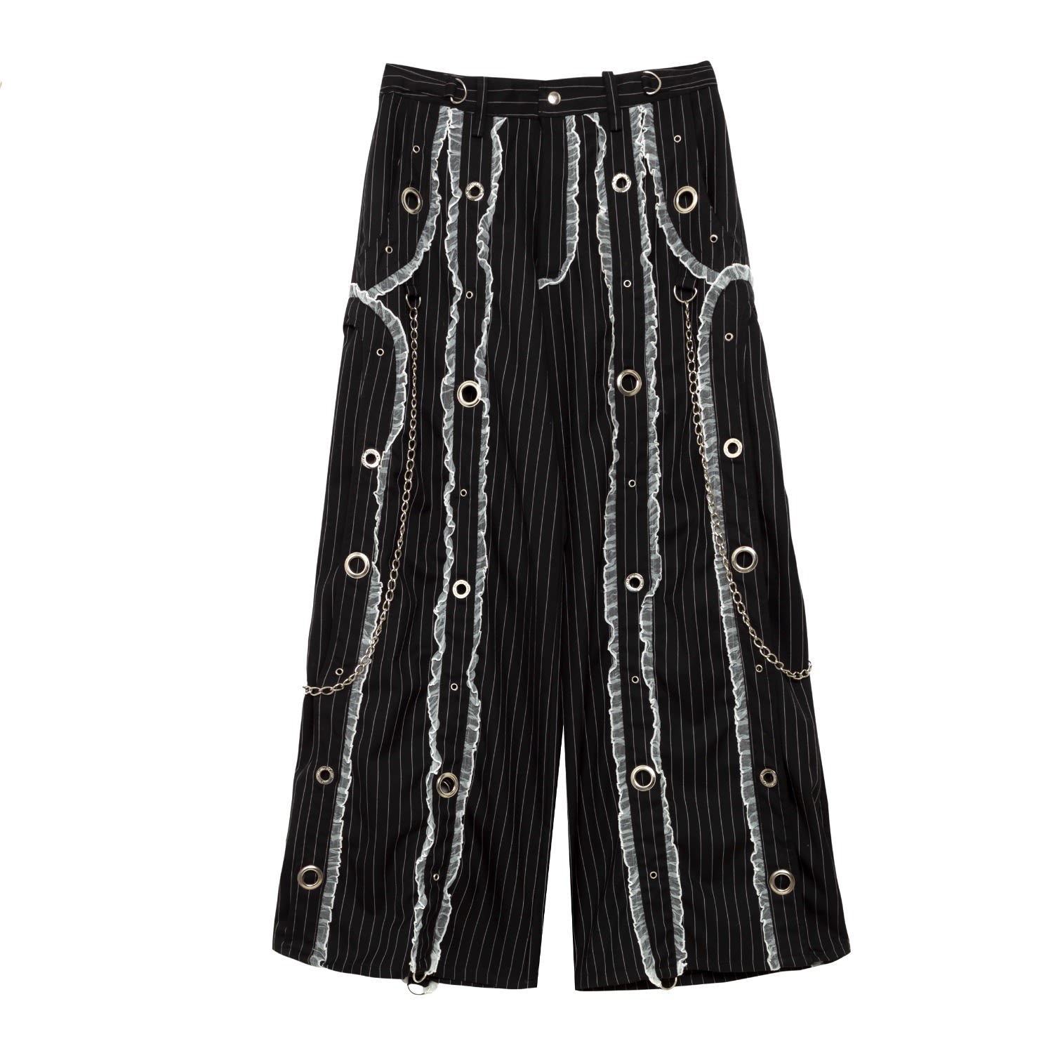 Black wide leg pants with white organsa fine draped strips on seams, it has silver logo eyelets and silver chains. Really cool with any of our tops and you can make a total look with the Black Parade Vest. They are unisex. With this collection, Paloma looks back to her teenager in which she based big part of her identity, representing this side or her in a nostalgic way. Under the Black Rainbow collection and prints are inspired in countercultures and social groups that represent this late 90’s and early 2000’s, being these groups influential in emo, punk and grunge aesthetics, reflecting how it inspired this generation musically and culturally and how it is evolves to these days and the future. Dry clean only, delicate