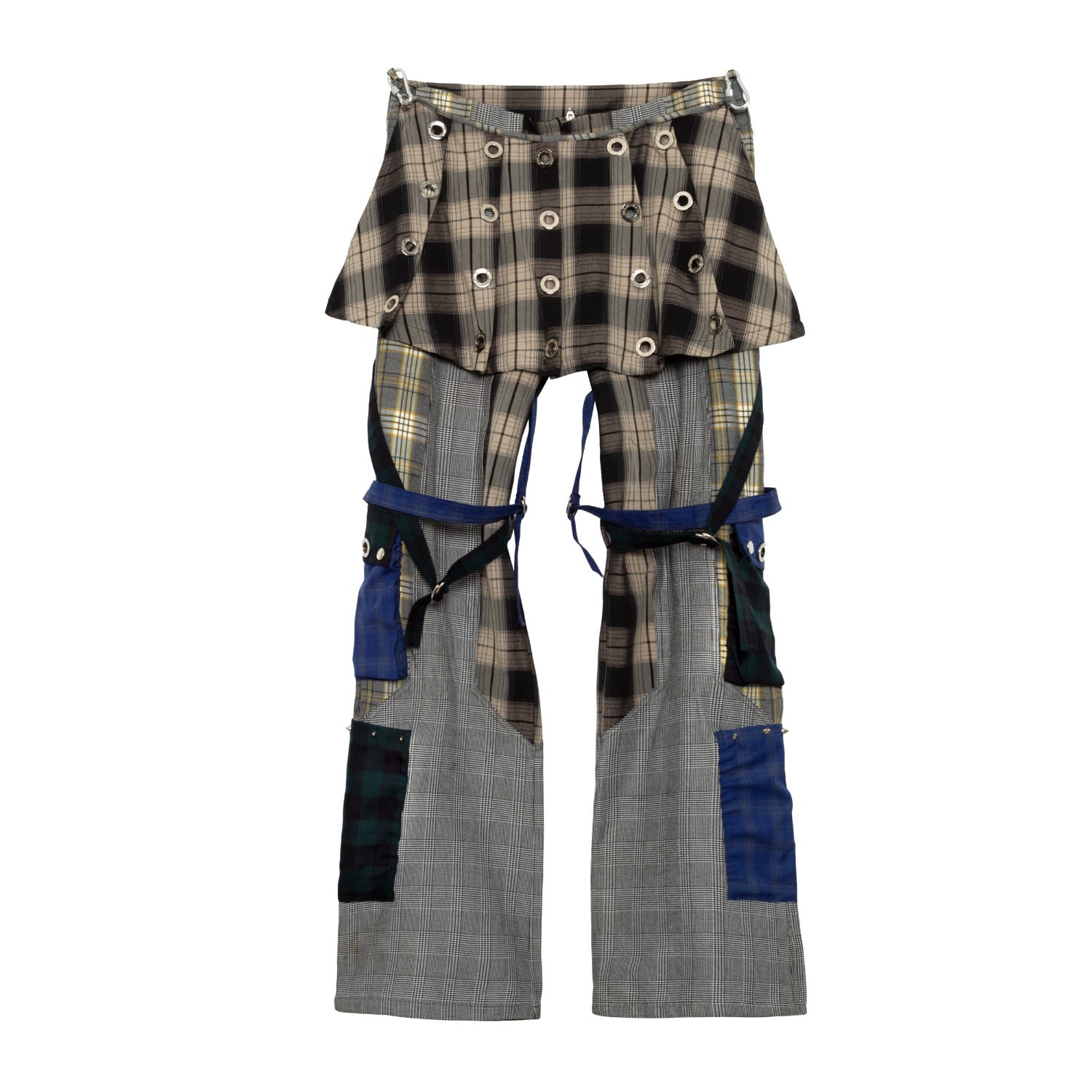 Patchwork plaid wide pants with straps to adjust, zipper on the front. It comes with a skirt with eyelets, you can wear it with or without it. You can wear this with the School Blazer and create a total look. Dry clean only