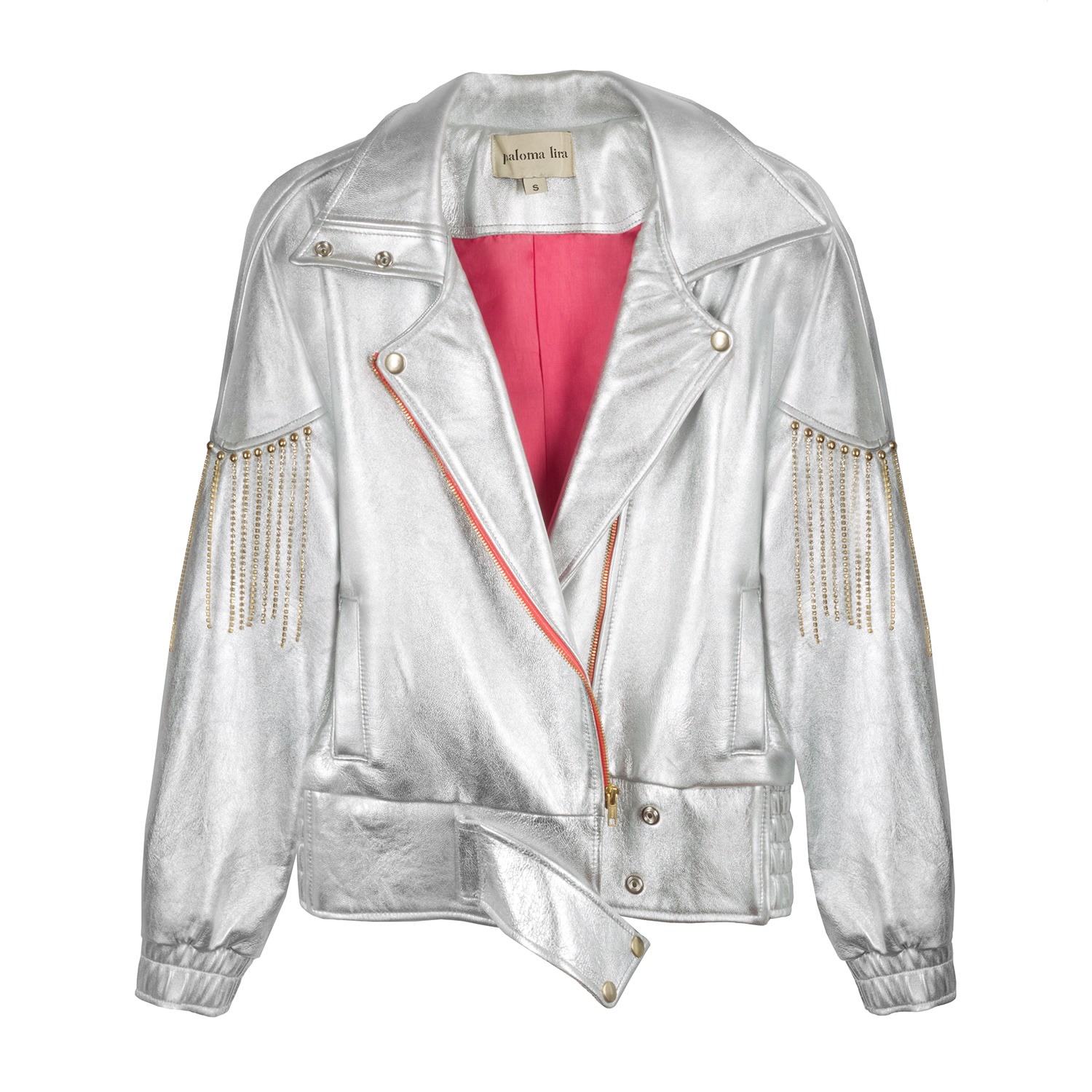 Silver leather biker with pink lining and diamond chains as fringe and golden studs. Perfect for a night out. You can combine it with the Silver leather shorts and create the complete look. 100% leather - lining: 100% polyester Dry clean