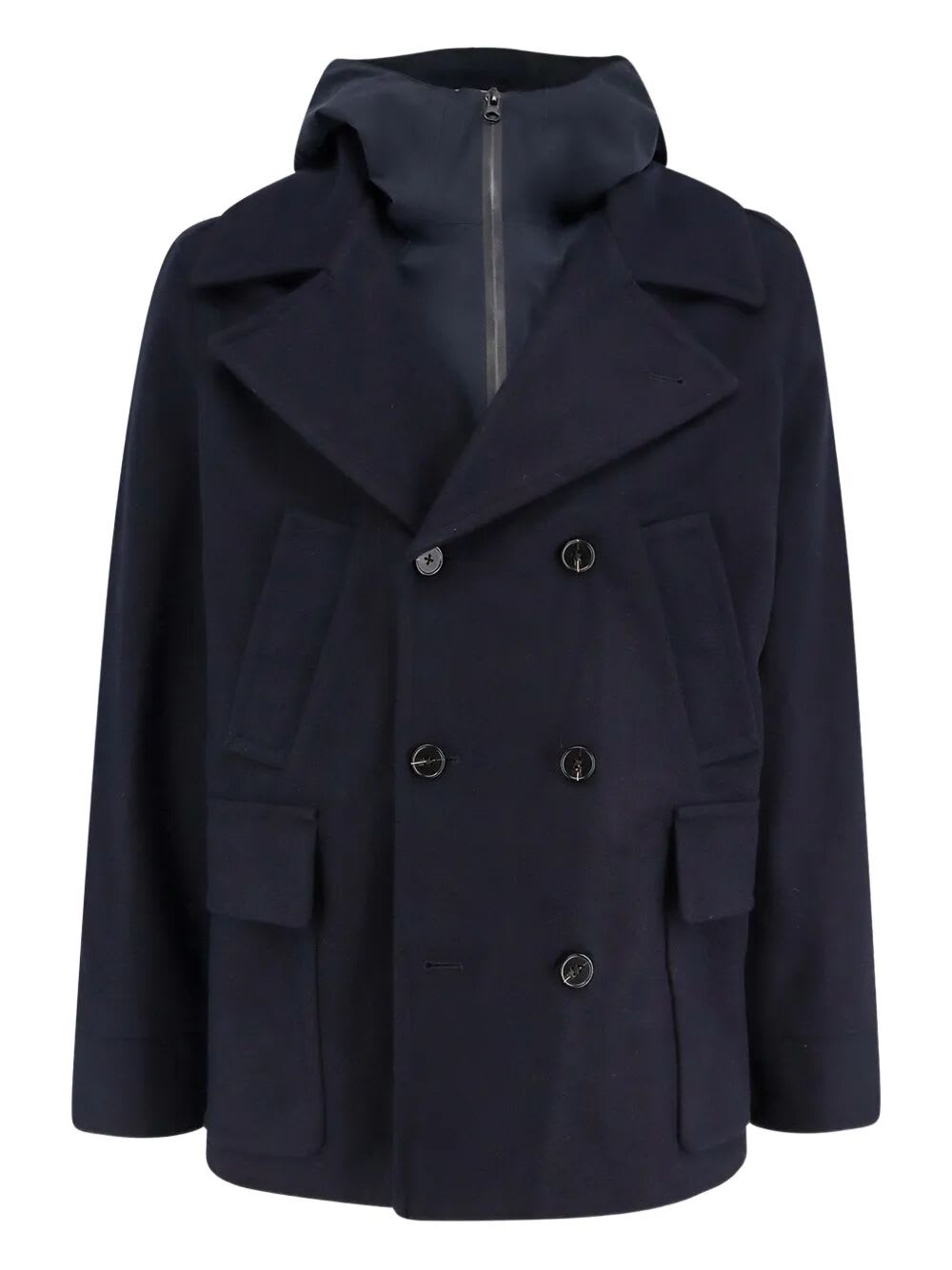 Material: 80% wool, 20% nylon. Long sleeves. Single-breasted. Double front pocket. Straight hem. Pointed collar. Button and zip closure. Hooded. Made in Italy