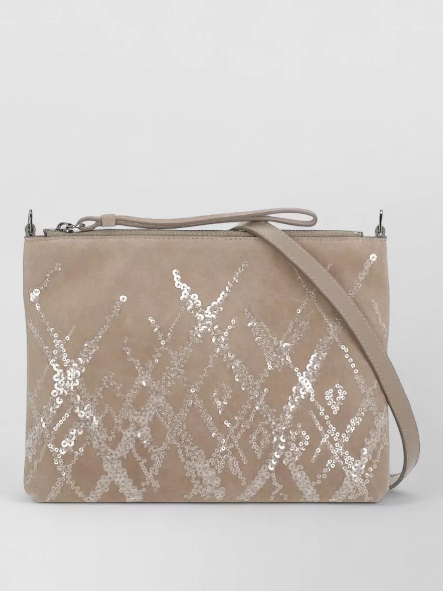 Brown leather pochette | Front sequin detailing | Removable shoulder strap | Top handle | Interior pocket