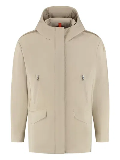 sand beige concealed front zip fastening front zip fastening pockets two front flap pockets classic hood