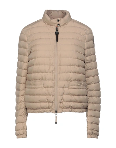 techno fabric, logo, solid color, single-breasted , round collar, long sleeves, snap-buttons, zip, multipockets, duck down filling, contains non-textile parts of animal origin , Color: Beige , Size: L
