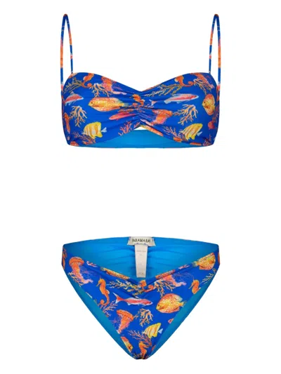 blue sea life print ruched detailing adjustable straps bandeau top Be mindful to try on swimwear over your own garments.