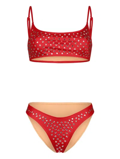 bright red pull-on style adjustable spaghetti straps silver-tone stud detailing Be mindful to try on swimwear over your own garments.