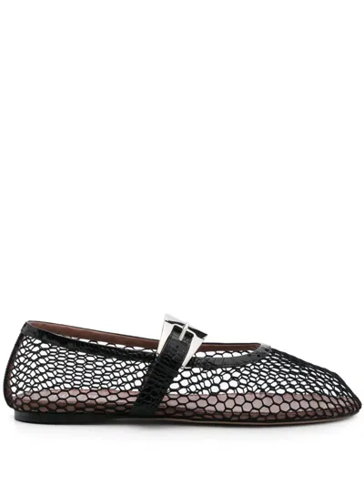 Paris Texas presents an exquisite pair of ballet flats, meticulously crafted with a distinct mesh-embossed croco design. The pointed toe silhouette and refined buckle strap create a harmonious blend of sophistication and contemporary style. Engineered for breathability, these flats ensure all-day comfort while elevating your ensemble. Perfect for the modern woman, they make a statement of effortless elegance. 90% Polyamide, 10% Calf Color - Black Flats