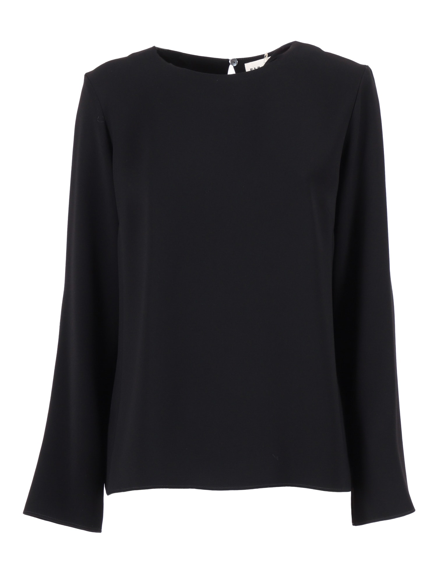 A refined black blouse from P.A.R.O.S.H. showcases sophistication through its classic silhouette and elegantly gathered cuffs. The round neckline enhances its elegance, and the smooth finish from the 100% polyester fabric makes it a versatile wardrobe staple. Color - Black Material - 100% Polyester Neckline - Round Cuffs - Gathered Style - Classic silhouette