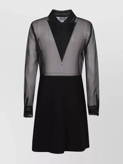 Classic shirt collar | Long sleeves | Mini design | Skirt length above the knee | Pure silk material | Sheer silk at the top | Sheer overlay | Featuring ruffles | Buttons on the cuffs | Front button closure