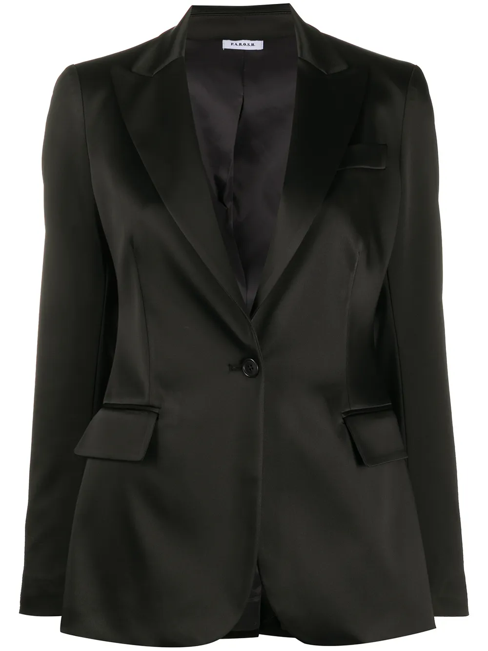 Black single-breasted satin blazer from P.A.R.O.S.H. featuring peaked lapels, a front button fastening, front flap pockets, a fitted waist and a rear central vent.